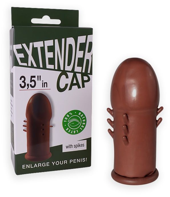 Коричневый латексный удлинитель пениса 3.5 in с шипиками. Прирост длины - 8,9 см.