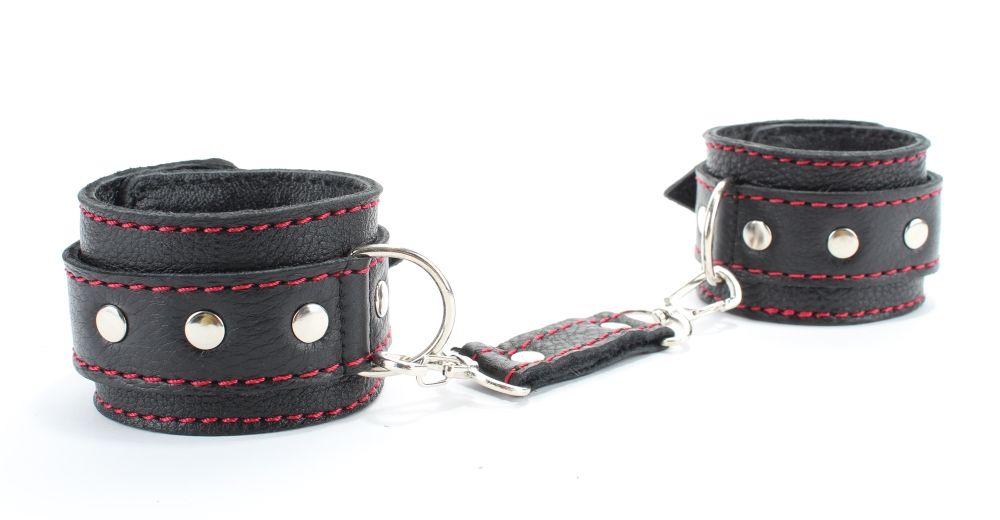 Оживить эротические игры Вам помогут наручники. Этот интимный аксессуар пользуется успехом. Выполненные в черном цвете с красной строчкой и декорированы заклепками. Модный интимный аксессуар не сдавливает и не нарушает кровообращение, так как изготовлен из мягкой кожи. Чтобы любимая никуда не убежала, наручники соединены короткой перемычкой. Длина перемычки - 6 см. Ширина оков - 5 см.
