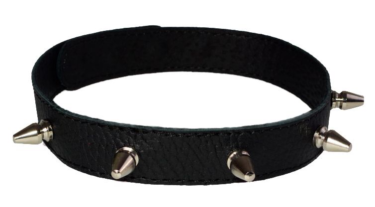 Изготовлен из натуральной кожи с велюровой подкладой. При изготовлении использована никелированная фурнитура. Размер универсальный, регулируется при помощи кнопок. Ширина - 2 см. Длина шипов - 1,2 см.