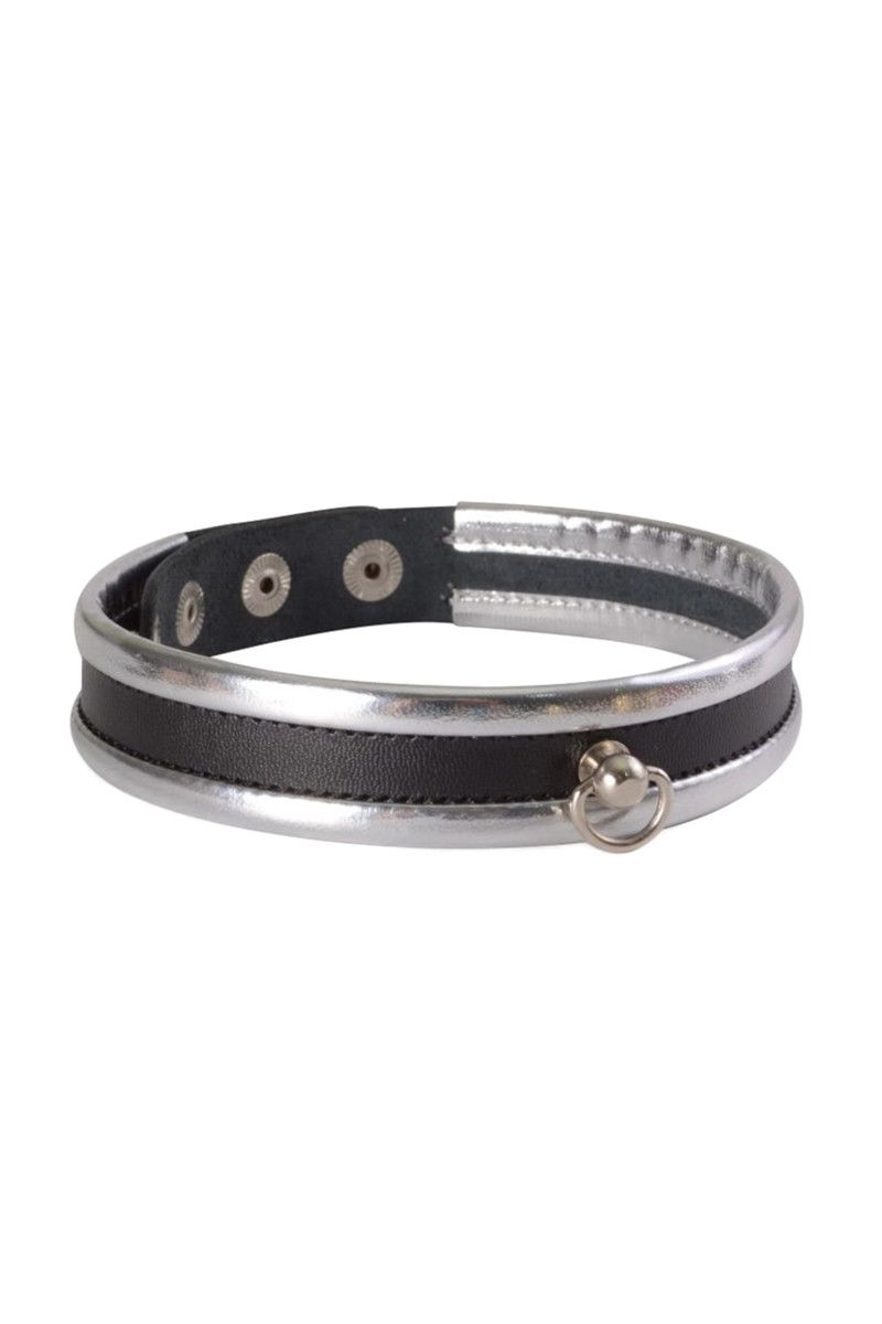 Узкий ошейник из плотной натуральной высококачественной кожи черного цвета с серебряной контрастной отделкой. По краю ошейника проходит оторочка, обеспечивающая комфорт при ношении. На внешней части имеется небольшое D-образное колечко, за которое можно зацепить поводок (в комплект не входит). Ширина - 2 см.