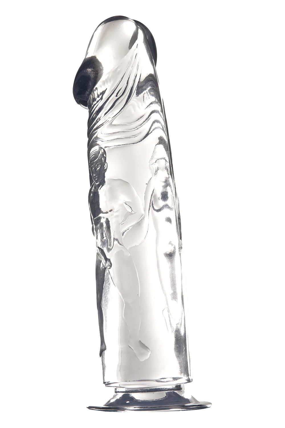 Прозрачный фаллоимитатор с фигурками на поверхности. Рабочая длина - 20 см.